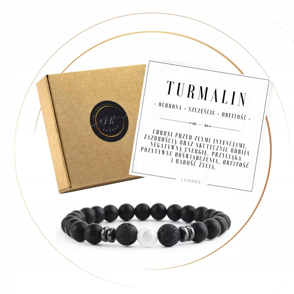 Bransoletka została wykonana z naturalnego turmalinu, którego głęboka czerń nadaje całości elegancki i nowoczesny charakter. Jego matowa powierzchnia podkreśla minimalistyczny styl biżuterii.