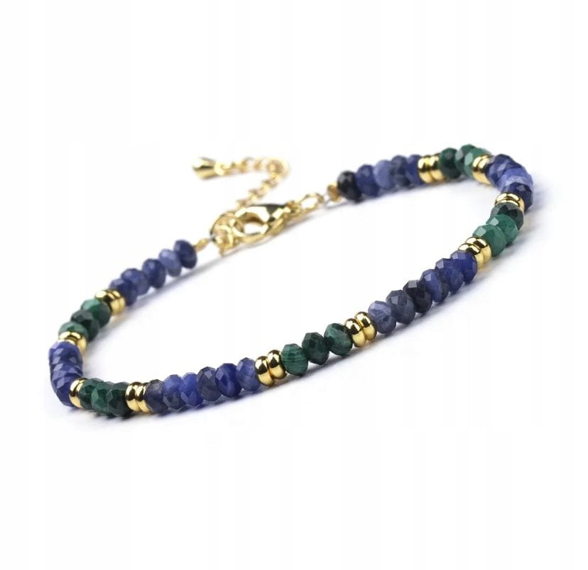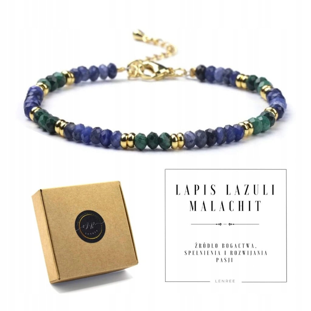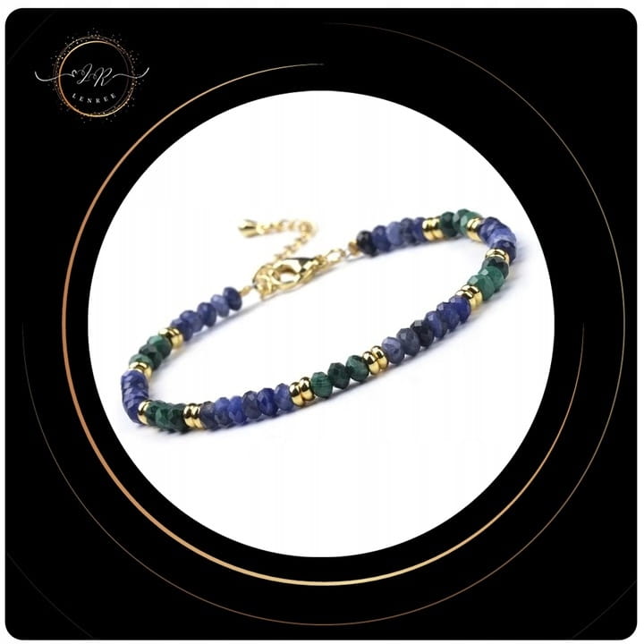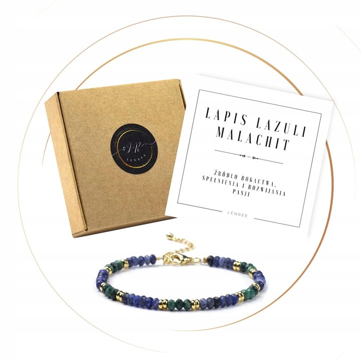Bransoletka z lapisu lazuli i malachitu zachwyca głębią niebiesko-zielonych odcieni oraz eleganckimi złotymi akcentami. To połączenie nadaje jej wyjątkowego charakteru i subtelnego blasku.