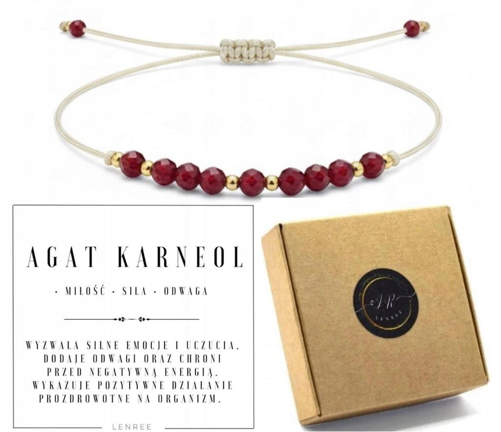 Delikatna i elegancka bransoletka wykonana z naturalnego fasetowanego agatu karneolu 3 mm, który znany jest jako kamień odwagi, siły i życiowej energii. Ciepłe, głębokie odcienie czerwieni dodają jej wyjątkowego charakteru oraz podkreślają naturalne piękno kamienia.