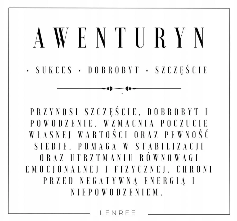 Awenturyn sprzyja także równowadze emocjonalnej i wewnętrznemu spokojowi, wspiera w redukcji stresu i budowaniu stabilności. To idealny kamień dla osób, które chcą wprowadzić do życia więcej harmonii i pozytywnej energii.