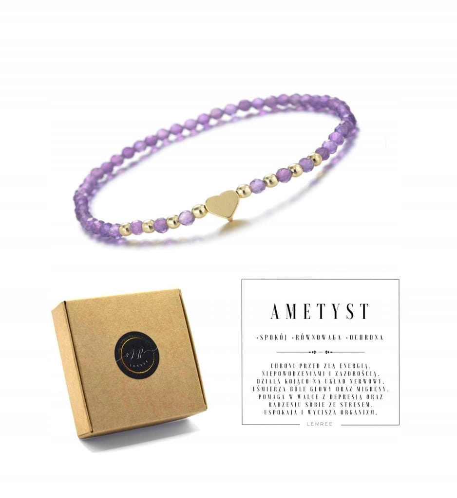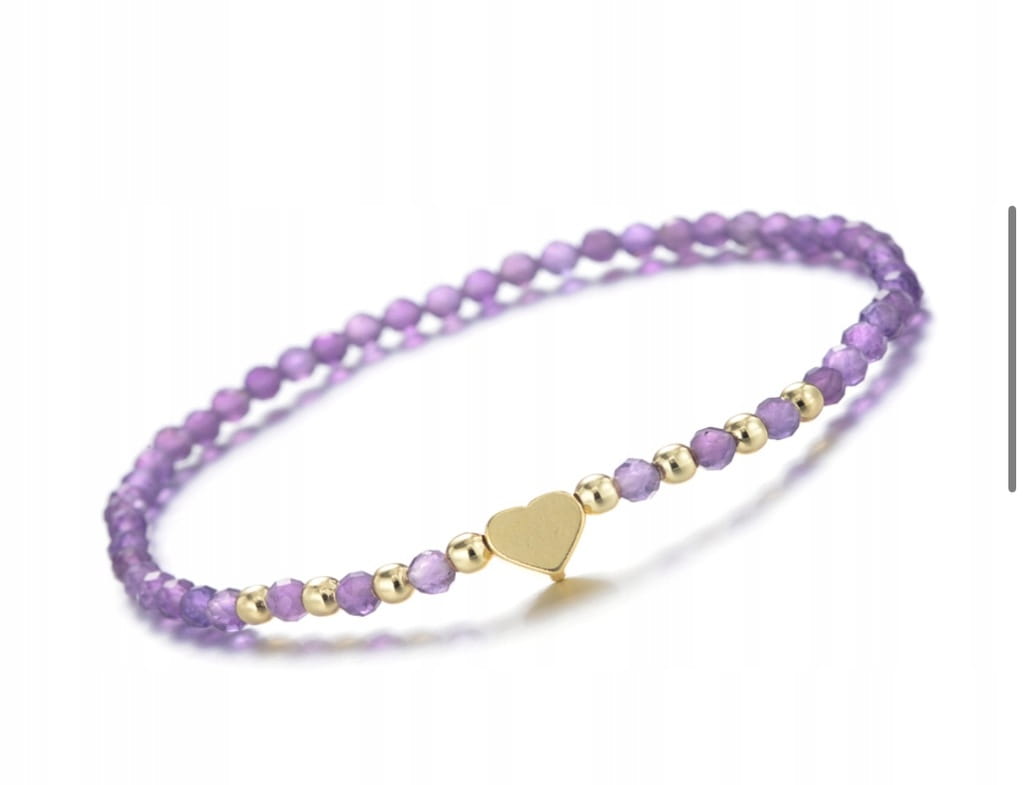 Przedstawiamy elegancką bransoletkę wykonaną z naturalnych kamieni ametystu o średnicy 4 mm, ozdobioną delikatnym małym sercem. To wyjątkowy dodatek, który doda uroku każdej stylizacji.