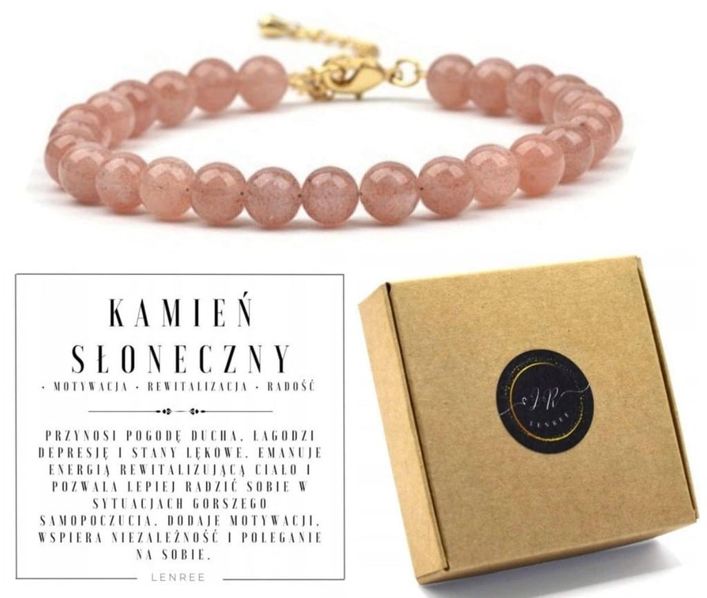 Wyjątkowa bransoletka wykonana z naturalnego kamienia słonecznego, który subtelnie mieni się w świetle, przyciągając spojrzenia i dobrą energię. Całość uzupełniona trwałymi elementami ze stali chirurgicznej 316L w kolorze złota, z wygodnym regulowanym zapięciem (16–19 cm).