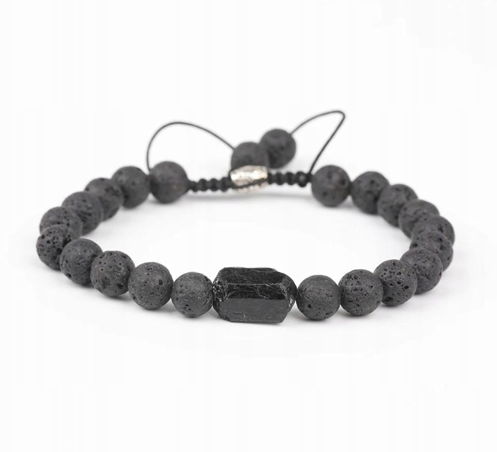Przedmiotem aukcji jest bransoletka damsko-męska zaciągana wykonana z kamieni naturalnych - LAWA WULKANICZNA i TURMALIN CZARNY.