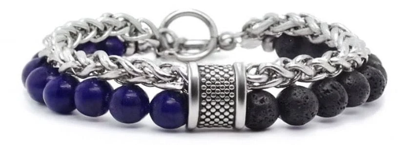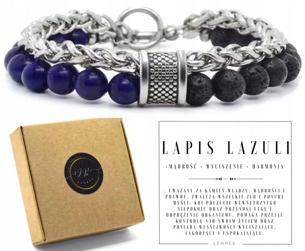 Elegancka bransoletka uniseks wykonana z naturalnych kamieni i stali szlachetnej. Połączenie lapis lazuli oraz czarnej lawy wulkanicznej nadaje jej wyjątkowego charakteru – łączy w sobie nowoczesny design i siłę natury.