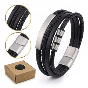 Bransoletka męska skórzana czarna pleciona stal srebrna magnetyczna LENREE