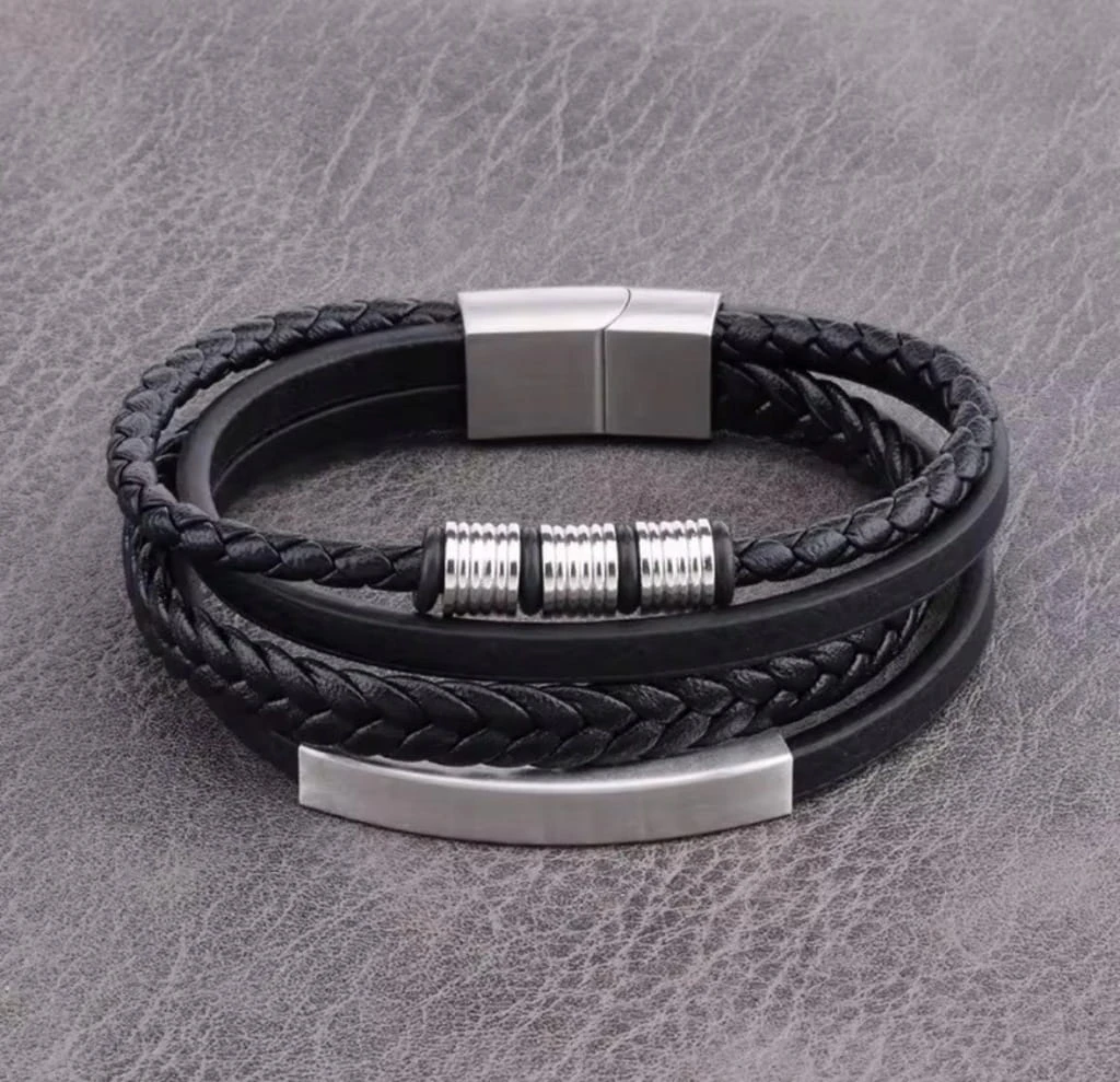 Elegancka bransoletka wykonana z wysokiej jakości skóry ekologicznej w klasycznej czerni. Połączenie plecionych i gładkich pasków tworzy nowoczesny, wielowarstwowy design.