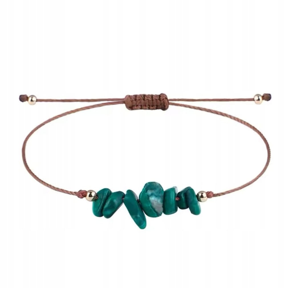 Stylowa i ręcznie wykonana bransoletka na regulowanym sznurku, ozdobiona naturalną sieczką z kamieni malachitu. Dzięki nieregularnym kształtom kamieni, bransoletka wyróżnia się unikalnym, naturalnym wyglądem, idealnym dla miłośników boho i minimalistycznych dodatków.