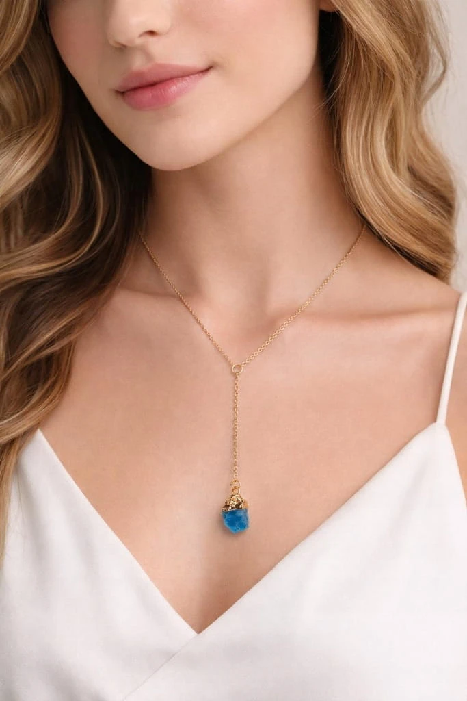 Wyjątkowy naszyjnik z naturalnym apatytem w surowej formie, który zachwyca intensywnym niebieskim kolorem oraz naturalną strukturą kamienia. Połączenie surowego minerału z delikatnym złotym łańcuszkiem tworzy biżuterię o eleganckim i jednocześnie naturalnym charakterze.