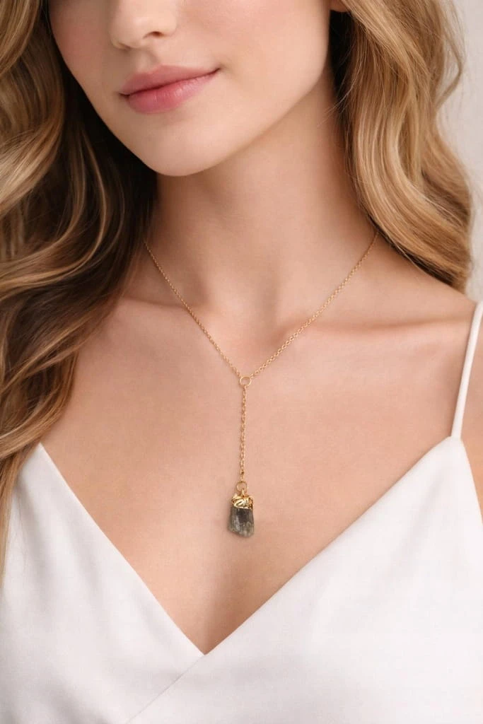 Wyjątkowy naszyjnik z naturalnym labradorytem w surowej formie, który zachwyca swoim tajemniczym połyskiem i unikalną strukturą. Każdy kamień jest niepowtarzalny, dzięki czemu biżuteria posiada indywidualny charakter.