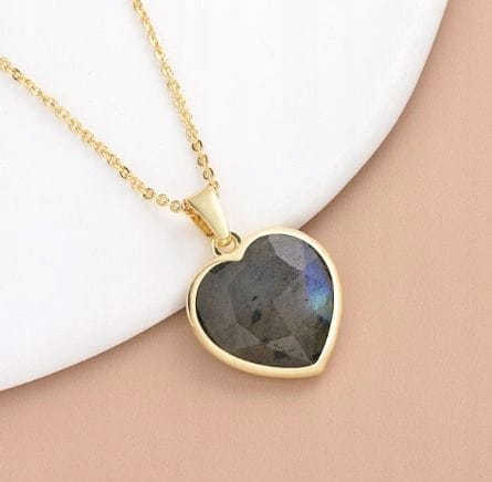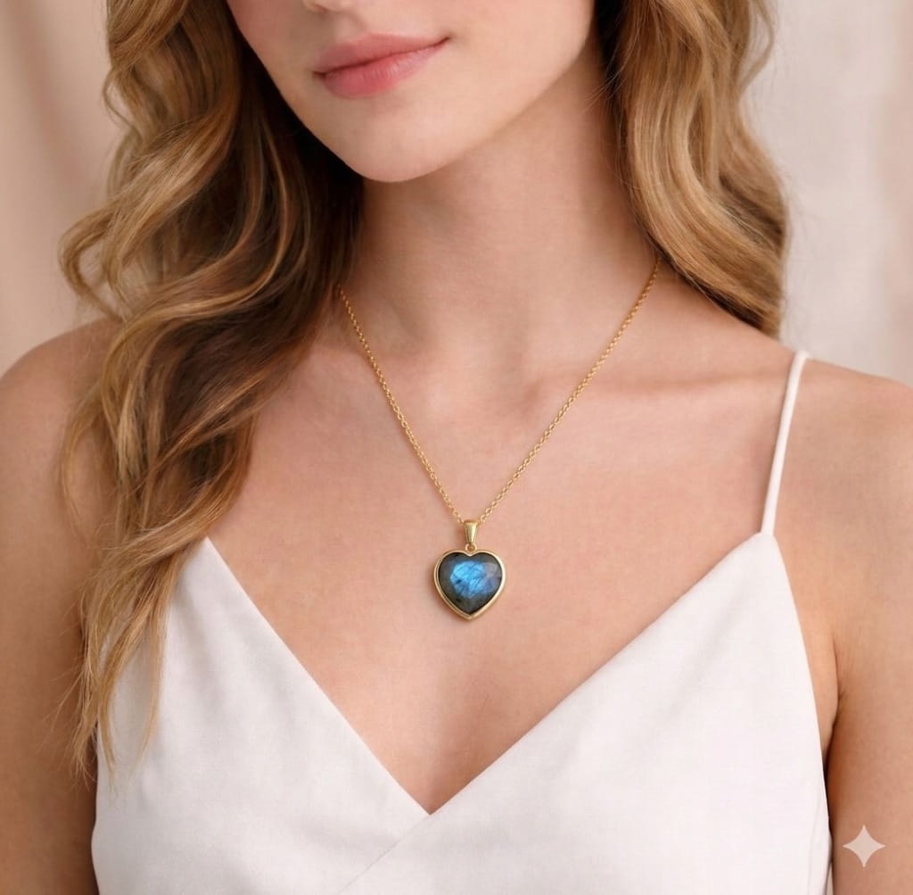 Elegancki i wyjątkowy naszyjnik z naturalnym labradorytem w kształcie serca. Kamień zachwyca charakterystycznym, niebiesko-złotym połyskiem, który pojawia się w świetle i tworzy niezwykły efekt głębi.